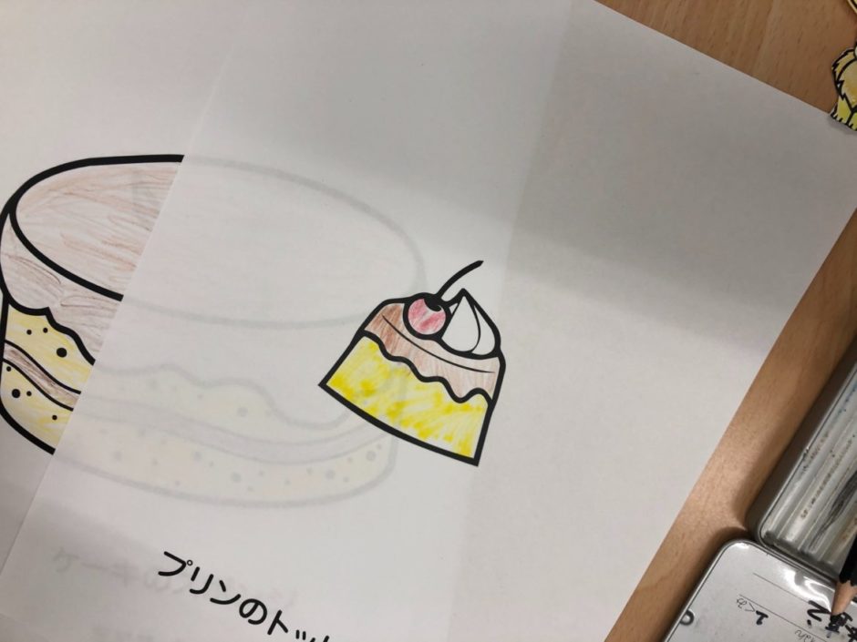 いちごやさくらの花びら、プリン、ローソクなど、たくさんの種類の中から自分だけのオリジナルケーキになるように選んで、色鉛筆で色を塗っていきます。