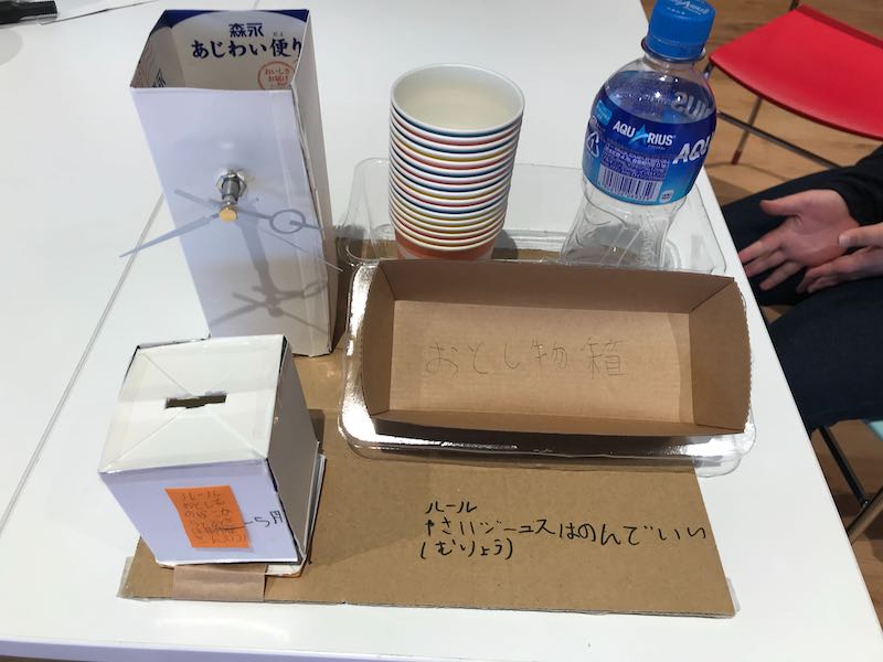 落とし物を拾ったらカゴに入れておき、所有者がそこで自分の落とし物を見つけたら、お礼としてお金を募金箱に入れる。野菜ジュースを飲みたい人は無料で飲める。